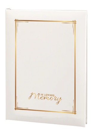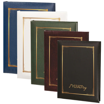 Our Decorative "In Loving Memory" Funeral Guest Book features a artistic design. “In Loving Memory” text and a border are stamped in gold foil. This Funeral Guest Book is available in a multitude of colors – Black, Burgundy, Green, Navy Blue and White.