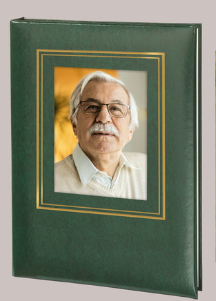 Our Double Border Rectangle Photo Funeral Guest Book is a simple, yet classic guest book design. This guest book features a rectangular window bordered by a gold foil frame. The window serves as a display for a standard 4”x6” photograph which slides into a secure pocket on the inside cover of the guest book. The Rectangle Photo Funeral Guest Book would be the perfect choice for those looking to display an image of their loved one.