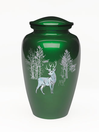 Exquisite Series Deer CREMATION URN. The urn is made from solid metal and the perfect lacquer coat to preserve its brilliance. It comes with a top opening, a threaded lid, and felt bottom. The GREEN finish with Inlaid Mother of Pearl Filler are uniquely handcrafted for each urn to show beautiful detail giving the FUNERAL URN a unique look to each finished product. Our urns are handcrafted uniquely by an ancient process called sand casting.