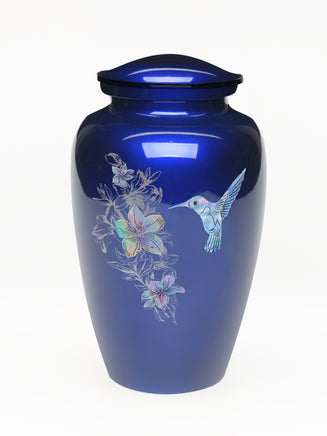 Exquisite Series Hummingbird CREMATION URN. The urn is made from solid metal and the perfect lacquer coat to preserve its brilliance. It comes with a top opening, a threaded lid, and felt bottom. The Blue finish with Inlaid Mother of Pearl Filler are uniquely handcrafted for each urn to show beautiful detail giving the FUNERAL URN a unique look to each finished product. Our urns are handcrafted uniquely by an ancient process called sand casting.