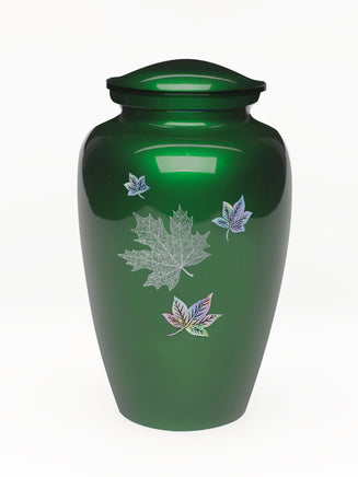 Exquisite Series Leaves CREMATION URN. The urn is made from solid metal and the perfect lacquer coat to preserve its brilliance. It comes with a top opening, a threaded lid, and felt bottom. The GREEN finish with Inlaid Mother of Pearl Filler are uniquely handcrafted for each urn to show beautiful detail giving the FUNERAL URN a unique look to each finished product. Our urns are handcrafted uniquely by an ancient process called sand casting.