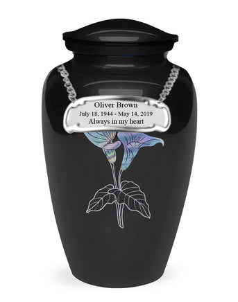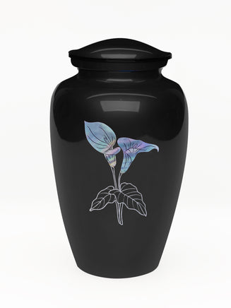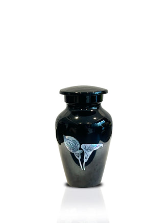 Exquisite Series Lily CREMATION URN. The urn is made from solid metal and the perfect lacquer coat to preserve its brilliance. It comes with a top opening, a threaded lid, and felt bottom. The Black finish with Inlaid Mother of Pearl Filler are uniquely handcrafted for each urn to show beautiful detail giving the FUNERAL URN a unique look to each finished product. Our urns are handcrafted uniquely by an ancient process called sand casting.