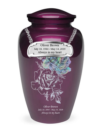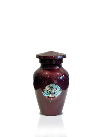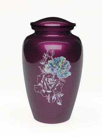 Exquisite Series Rose CREMATION URN. The urn is made from solid metal and the perfect lacquer coat to preserve its brilliance. It comes with a top opening, a threaded lid, and felt bottom. The Burgundy finish with Inlaid Mother of Pearl Filler are uniquely handcrafted for each urn to show beautiful detail giving the FUNERAL URN a unique look to each finished product. Our urns are handcrafted uniquely by an ancient process called sand casting.