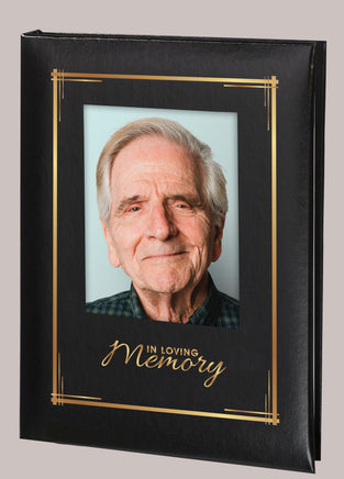 Our In Loving Memory Rectangle Photo Funeral Guest Book is a simple, yet classic guest book design. This guest book features a rectangular window bordered by a gold foil frame. The window serves as a display for a standard 4”x6” photograph which slides into a secure pocket on the inside cover of the guest book. The Rectangle Photo Funeral Guest Book would be the perfect choice for those looking to display an image of their loved one.