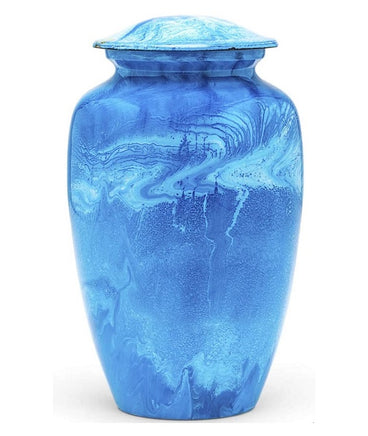 This Classic Blue Urn is a Genuine Hand-crafted product ensuring each urn is UNIQUE and DURABLE, as well as ECONOMIC. Classic Blue Urn fits the remains of most adults weighing up to 200 lbs. The urn is made from solid metal and the perfect lacquer coat to preserve its brilliance. It comes with top opening with a threaded lid and felt bottom.