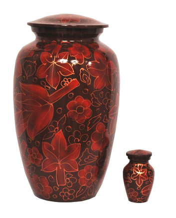 The Classic Floral Cremation Urn is finished in red & black color. The urn is made from solid metal and the perfect lacquer coat to preserve its brilliance. It comes with a top opening, a threaded lid, and felt bottom.