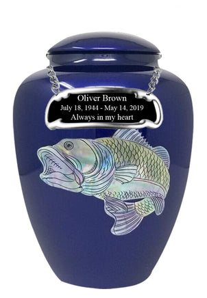 The Shell art series - Bass Cremation urn is made from fiberglass with Mother of Pearl inlaid Bass. It has got the perfect lacquer coat to preserve its brilliance. It comes with a top opening with a secured lid. The Blue finish with Inlaid Mother of Pearl Filler are uniquely handcrafted for each urn to show beautiful detail giving the FUNERAL URN a unique look to each finished product.