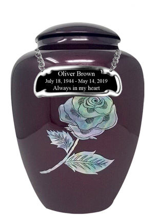 The Shell Art series - Burgundy Rose Cremation urn is made from fiberglass with Mother of Pearl inlaid Rose. It has got the perfect lacquer coat to preserve its brilliance. It comes with top opening with a secured lid. The Dark Burgundy finish with Inlaid Mother of Pearl Filler are uniquely handcrafted for each urn to show beautiful detail giving the FUNERAL URN a unique look to each finished product.