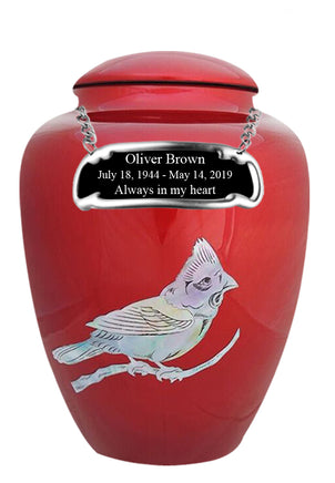 The Shell Art series - Red Cardinal Cremation urn is made from fiberglass with Mother of Pearl inlaid Cardinal. It has got the perfect lacquer coat to preserve its brilliance. It comes with a top opening with a secured lid. The Red finish with Inlaid Mother of Pearl Filler are uniquely handcrafted for each urn to show beautiful detail giving the FUNERAL URN a unique look to each finished product.
