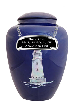 The Shell Art series - Lighthouse Cremation urn is made from fiberglass with Mother of Pearl inlaid Lighthouse. It has got the perfect lacquer coat to preserve its brilliance. It comes with a top opening with a secured lid. The Blue finish with Inlaid Mother of Pearl Filler are uniquely handcrafted for each urn to show beautiful detail giving the FUNERAL URN a unique look to each finished product.