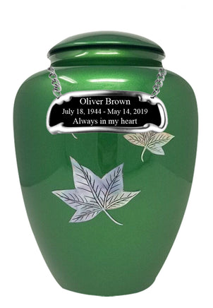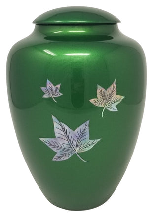 The Shell Art series - Maple Leaf Cremation urn is made from fiberglass with Mother of Pearl inlaid maple Leaf. It has got the perfect lacquer coat to preserve its brilliance. It comes with a top opening with a secured lid. The Green finish with Inlaid Mother of Pearl Filler are uniquely handcrafted for each urn to show beautiful detail giving the FUNERAL URN a unique look to each finished product.
