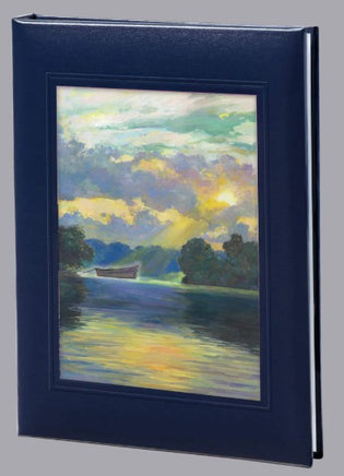 The "This Evening" Funeral Cremation Guest Book features a tranquil waterscape, showcasing a serene rowboat bathed in the soft glow of sunrays. The calming blue tones of the design evoke a sense of peace and reflection. This thoughtful tribute is complemented by the artwork of Catherine Elliot, capturing a moment of quiet beauty.