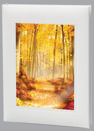 The Golden Forest Funeral Guest Book (#8580-BK) is designed with a glossy white cover, featuring a subtly embossed border that frames a stunning image of a tranquil forest path. The path, blanketed in fallen leaves and bordered by wildflowers, stretches into the distance, bathed in the warm, golden light of a setting sun.