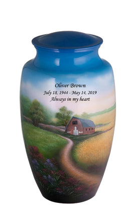 Hand Painted Farmstead CREMATION URN . The urn is made from solid metal and the perfect lacquer coat to preserve its brilliance. It comes with top opening with a threaded lid and felt bottom. The hand painted artwork is uniquely handcrafted for each urn to show beautiful detail giving the FUNERAL URN a unique look to each finished product. Our urns are handcrafted uniquely by an ancient process called sand casting.