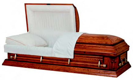 Oak - Satin Medium Finish, Nova Velvet Interior, and Pleated Head Panel.