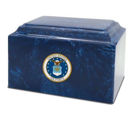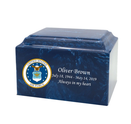 This United States Air Force Cremation Urn is made with the best cultured marble rocks and finished in rich blue color. This urn features an artistic US Air Force logo. Perfect for a military funeral service, or patriotic soul.