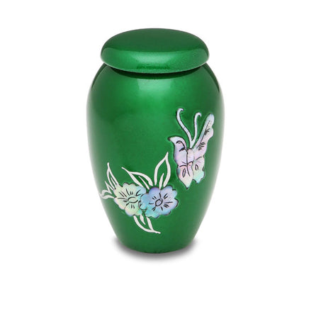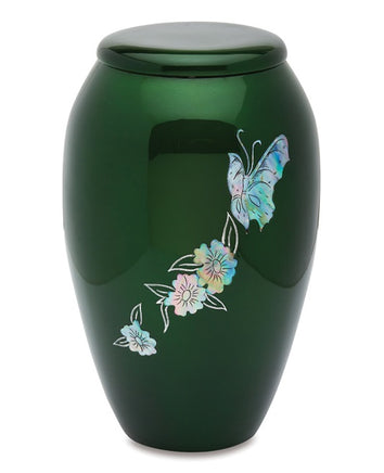 Mother of Pearl Butterfly on Green CREMATION URN. The urn is made from solid metal and the perfect lacquer coat to preserve its brilliance. It comes with a top opening, a threaded lid, and felt bottom. The Green finish with Inlaid Mother of Pearl Filler are uniquely handcrafted for each urn to show beautiful detail giving the FUNERAL URN a unique look to each finished product. Our urns are handcrafted uniquely by an ancient process called sand casting.
