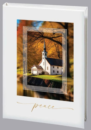 This elegant white Funeral Guest Book features a serene image of a white church, symbolizing tranquility and reverence. Beneath the church, the word "Peace" is gently displayed, adding a comforting and timeless sentiment. The design captures a sense of calm and reflection, making it a fitting tribute for honoring loved ones.