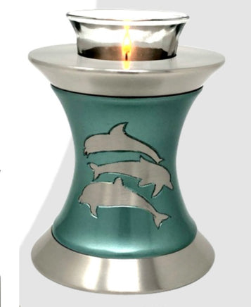 Infinityurn’s Solace Dolphins is an elegant and affordable Tea Light SMALL CREMATION URN. The Tealight urn is made from solid Brass and the perfect lacquer coat to preserve its brilliance. It comes with a top opening, a threaded lid for ashes, and a small candle holding space.