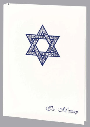 The Star of David Funeral Guest Book (#880) features a striking image of the Star of David, with "In Memory" text gracefully positioned in the lower right corner. The guest book is available in two elegant color options: an Ivory cover with gold foil or a rich Navy Blue cover with a silver foil image.