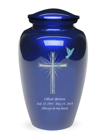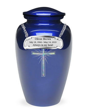 Exquisite Series Cross CREMATION URN. The urn is made from solid metal and the perfect lacquer coat to preserve its brilliance. It comes with a top opening, a threaded lid, and felt bottom. The Blue finish with Inlaid Mother of Pearl Filler are uniquely handcrafted for each urn to show beautiful detail giving the FUNERAL URN a unique look to each finished product. Our urns are handcrafted uniquely by an ancient process called sand casting.